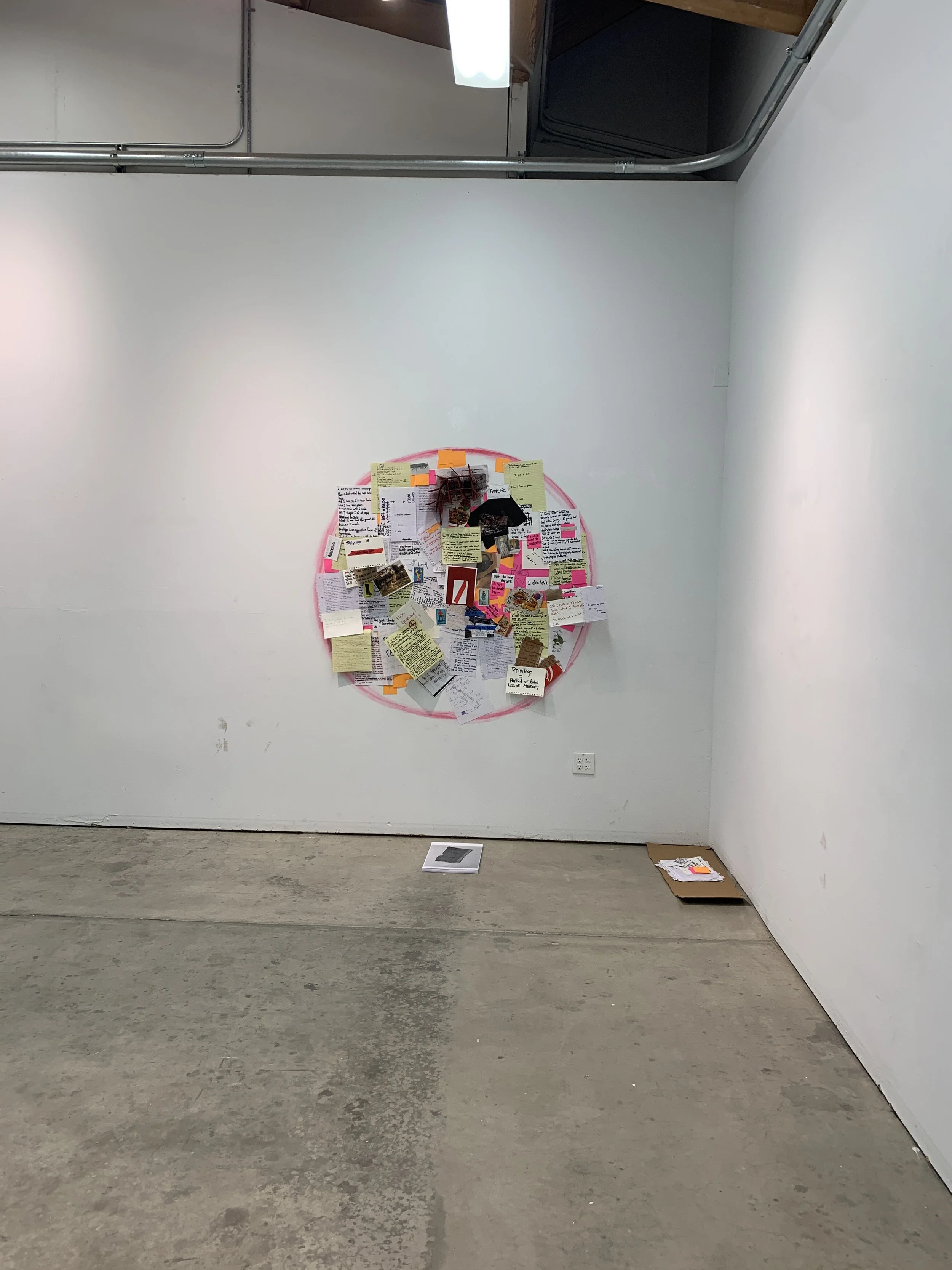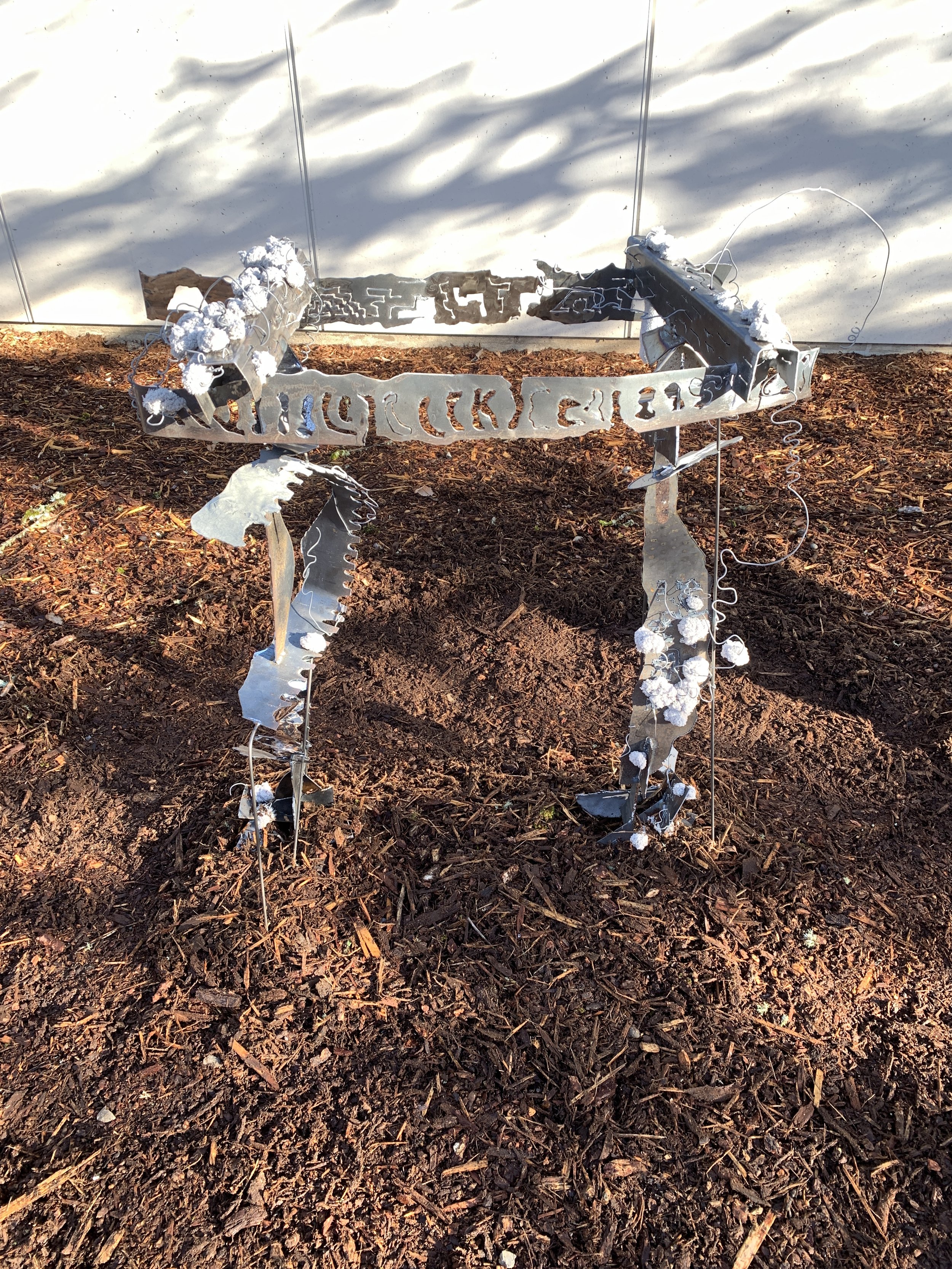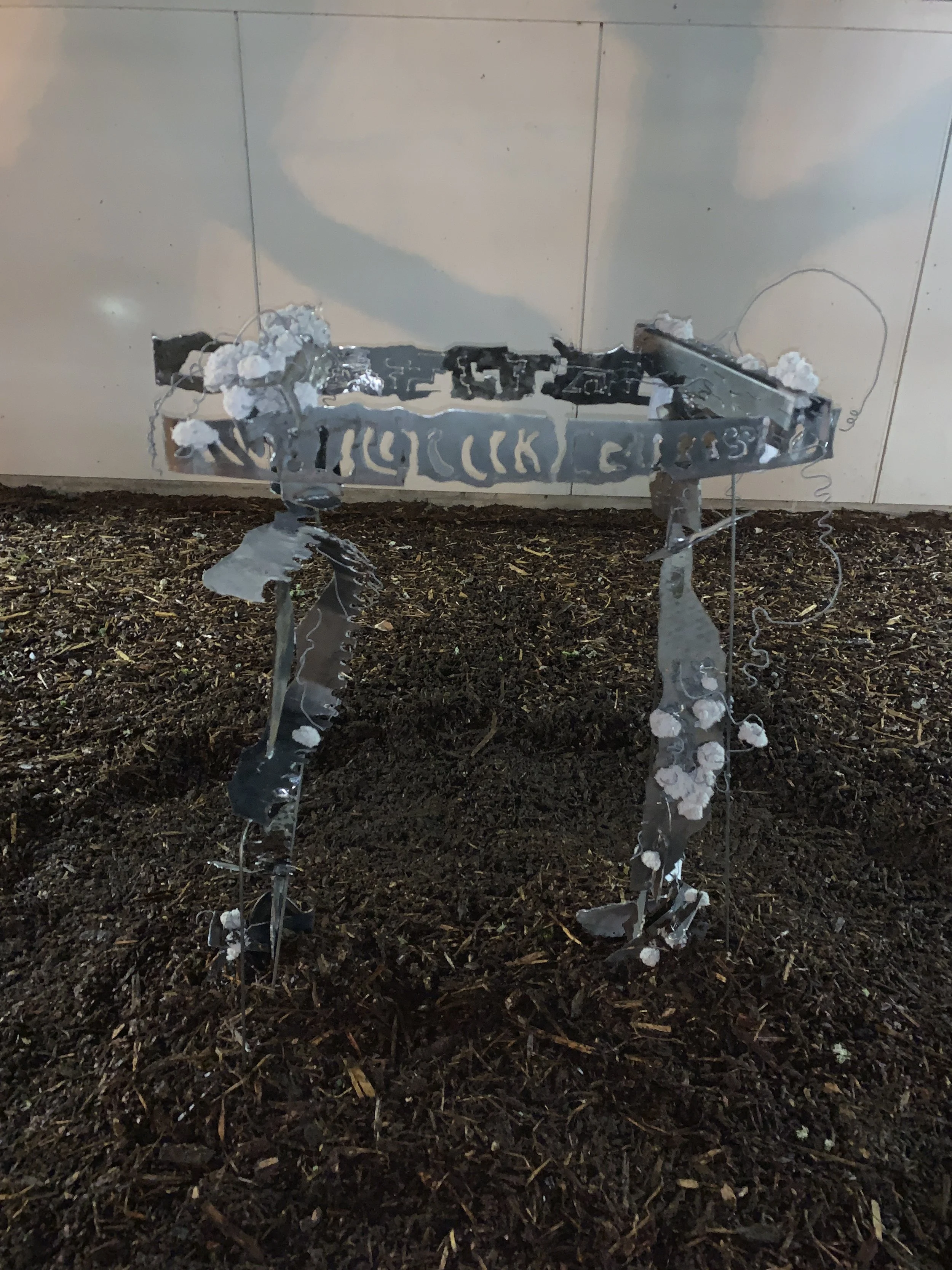Laser cut metal, fabric puff balls, and metal lined thin wire.